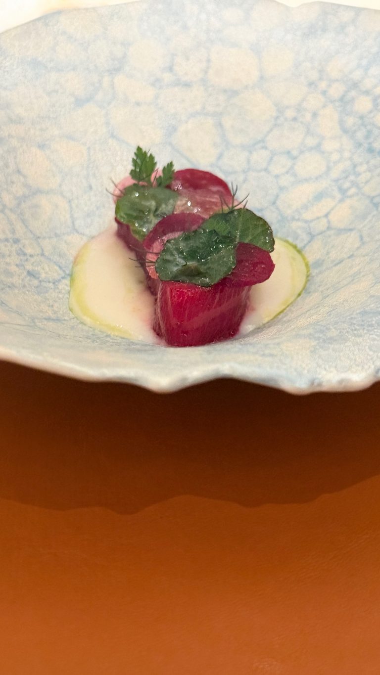 но основное, на мой вкус, это возможность ознакомиться с основным приемом маэстро, который он щедро использует в первых нескольких однобайтовых подачах — жонглирование вкусовыми градиентами и температурами, здесь, всё, как всегда — безупречно.